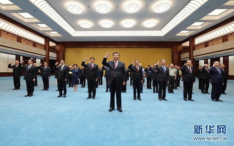 2021年6月18日,黨和國家領(lǐng)導人習近平、李克強、栗戰(zhàn)書、汪洋、王滬寧、趙樂際、韓正、王岐山等在中國共產(chǎn)黨歷史展覽館參觀“‘不忘初心、牢記使命’中國共產(chǎn)黨歷史展覽”。這是參觀結(jié)束后,習近平帶領(lǐng)黨員領(lǐng)導同志一起重溫入黨誓詞。新華社記者 李學仁 攝