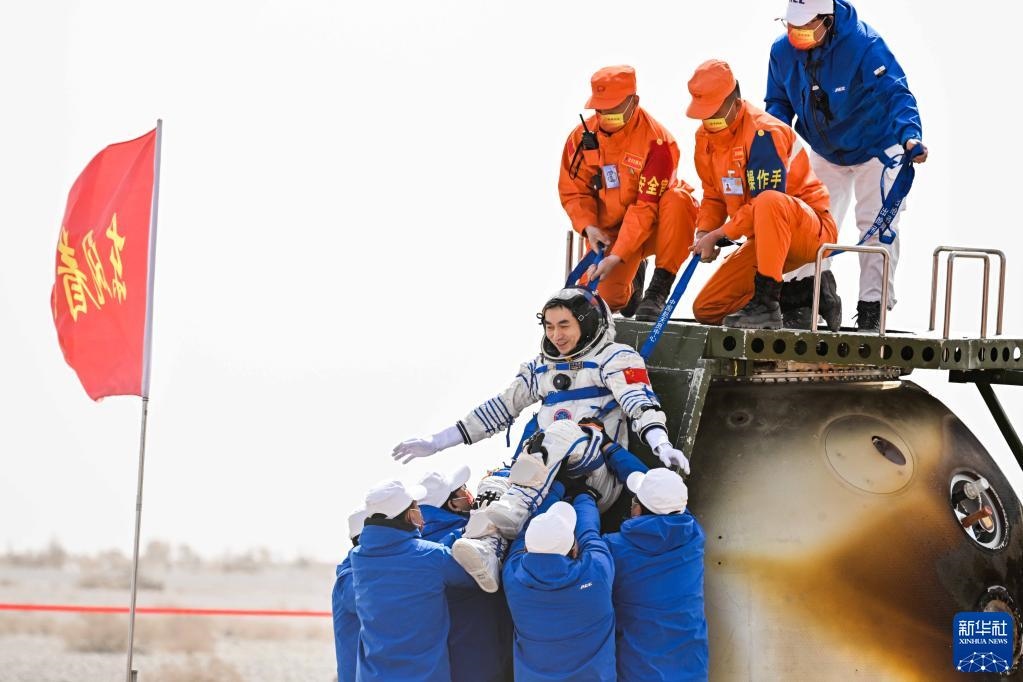 4月16日,神舟十三號載人飛船返回艙在東風著陸場成功著陸。這是航天員葉光富安全順利出艙。新華社記者 連振 攝