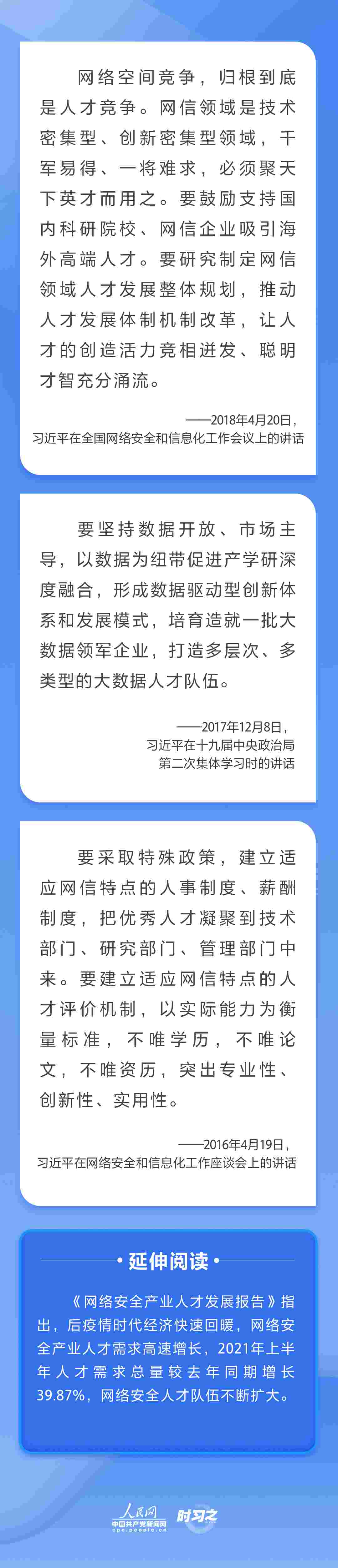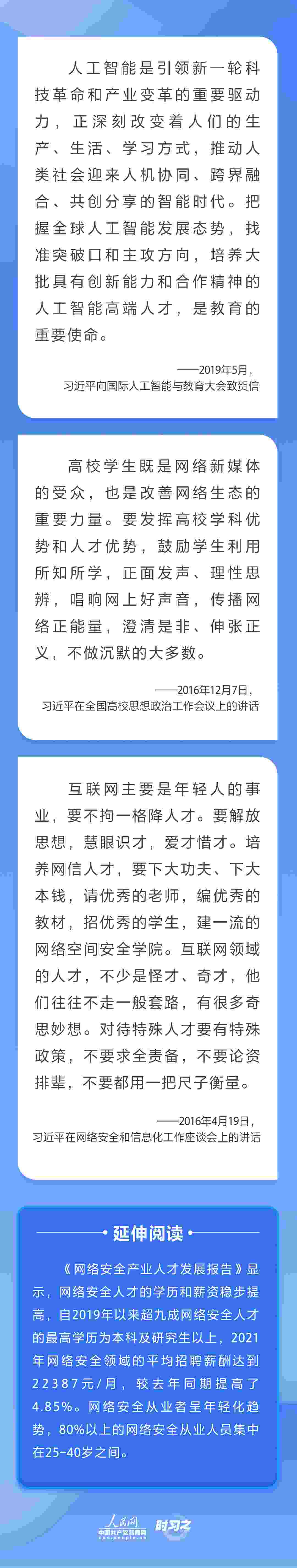 “網(wǎng)信領(lǐng)域是技術(shù)密集型、創(chuàng)新密集型領(lǐng)域,千軍易得、一將難求,必須聚天下英才而用之?!秉h的十八大以來,習(xí)近平總書記多次就網(wǎng)信事業(yè)發(fā)展作出重要論述,并將抓好人才工作擺在治國(guó)理政的重要位置,為新時(shí)代網(wǎng)信人才工作和網(wǎng)信人才事業(yè)發(fā)展指明了前進(jìn)方向。