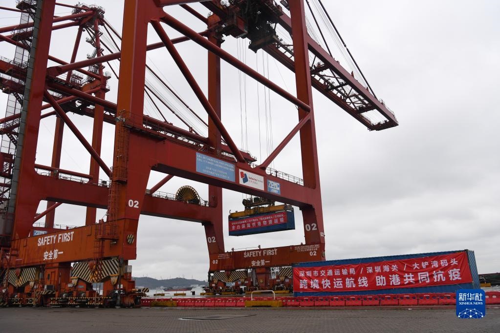 在深圳大鏟灣碼頭,滿載供港蔬菜、水果、雞蛋的集裝箱吊裝上船(2022年2月21日攝)。新華社記者 梁旭 攝