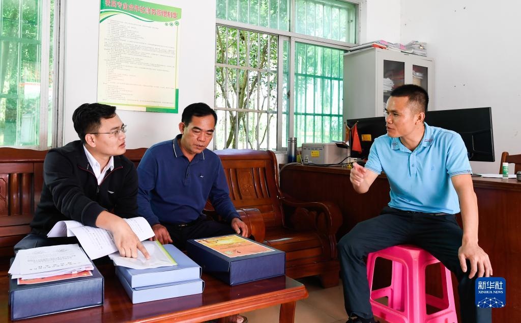 在海南省瓊中黎族苗族自治縣灣嶺鎮(zhèn)加章村委會,紀檢監(jiān)察干部(左一)在查閱鄉(xiāng)村振興及村級財務支出相關材料(2021年11月13日攝)。新華社記者 楊冠宇 攝