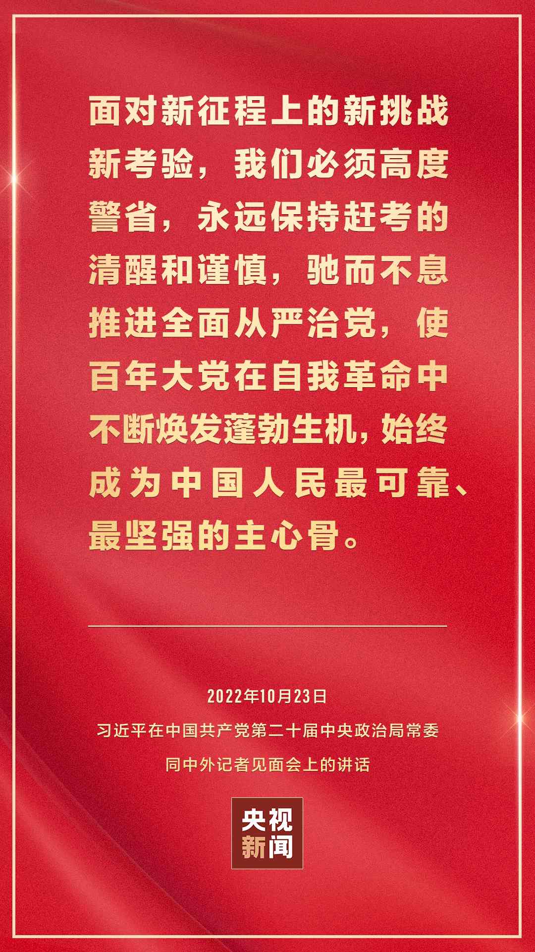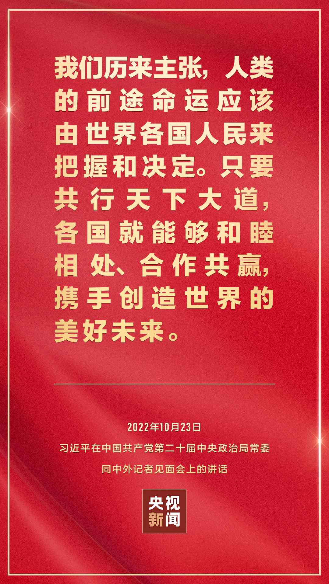 在中國(guó)共產(chǎn)黨第二十屆中央委員會(huì)第一次全體會(huì)議上當(dāng)選的中共中央總書記習(xí)近平和中共中央政治局常委李強(qiáng)、趙樂(lè)際、王滬寧、蔡奇、丁薛祥、李希,23日中午在人民大會(huì)堂同采訪中共二十大的中外記者見(jiàn)面。習(xí)近平發(fā)表重要講話。