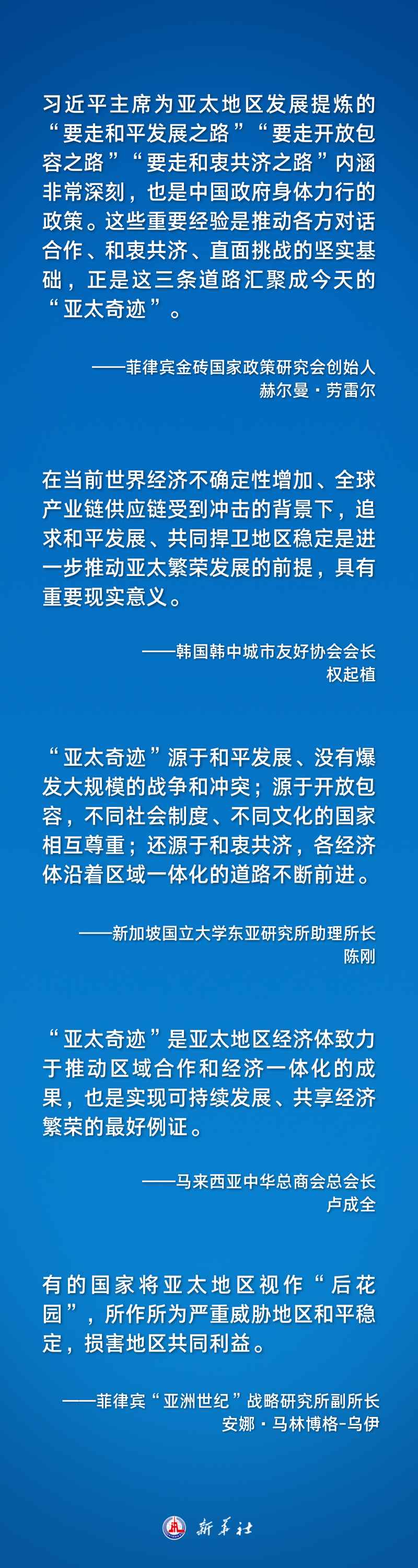 習(xí)近平主席在總結(jié)亞太合作的歷史經(jīng)驗(yàn)時指出:“亞太奇跡”是靠大家攜手奮斗、爬坡過坎創(chuàng)造的。亞太過去幾十年經(jīng)濟(jì)快速增長,得益于和平穩(wěn)定的環(huán)境。歷史反復(fù)證明,開放包容、合作共贏才是人間正道。