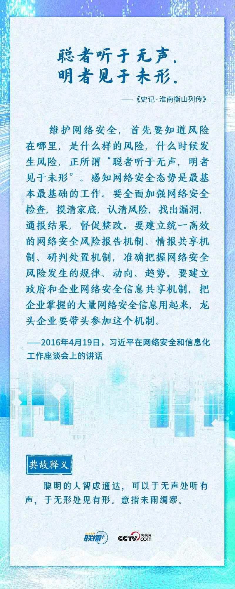 值此網(wǎng)絡(luò)安全和信息化工作座談會(huì)召開七周年之際,央視網(wǎng)《聯(lián)播+》推出海報(bào),邀您一起重溫總書記的經(jīng)典論述。