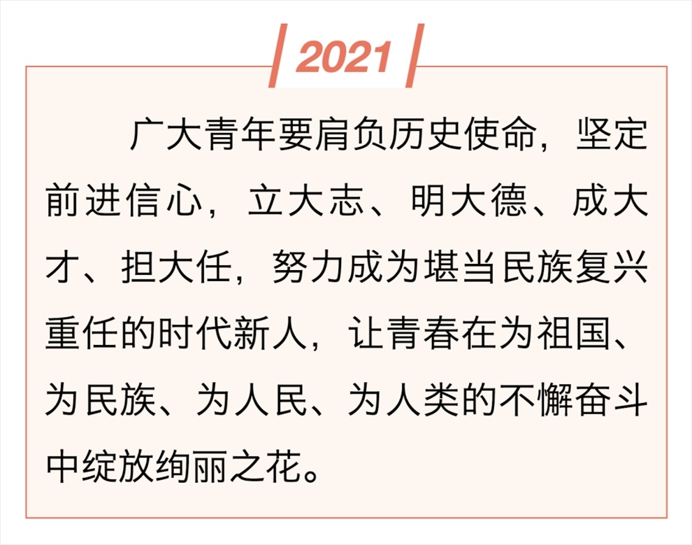 新時(shí)代新征程,中國(guó)青年將牢記總書(shū)記囑托,激揚(yáng)奮斗青春,擔(dān)當(dāng)時(shí)代重任,讓青春年華在奮斗與奉獻(xiàn)中煥發(fā)出絢麗光彩。