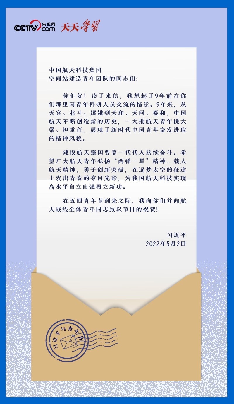 2022年5月2日,在五四青年節(jié)到來之際,中國(guó)航天科技集團(tuán)空間站建造青年團(tuán)隊(duì)收到了一份特別的節(jié)日禮物——一封落款為“習(xí)近平”的回信。