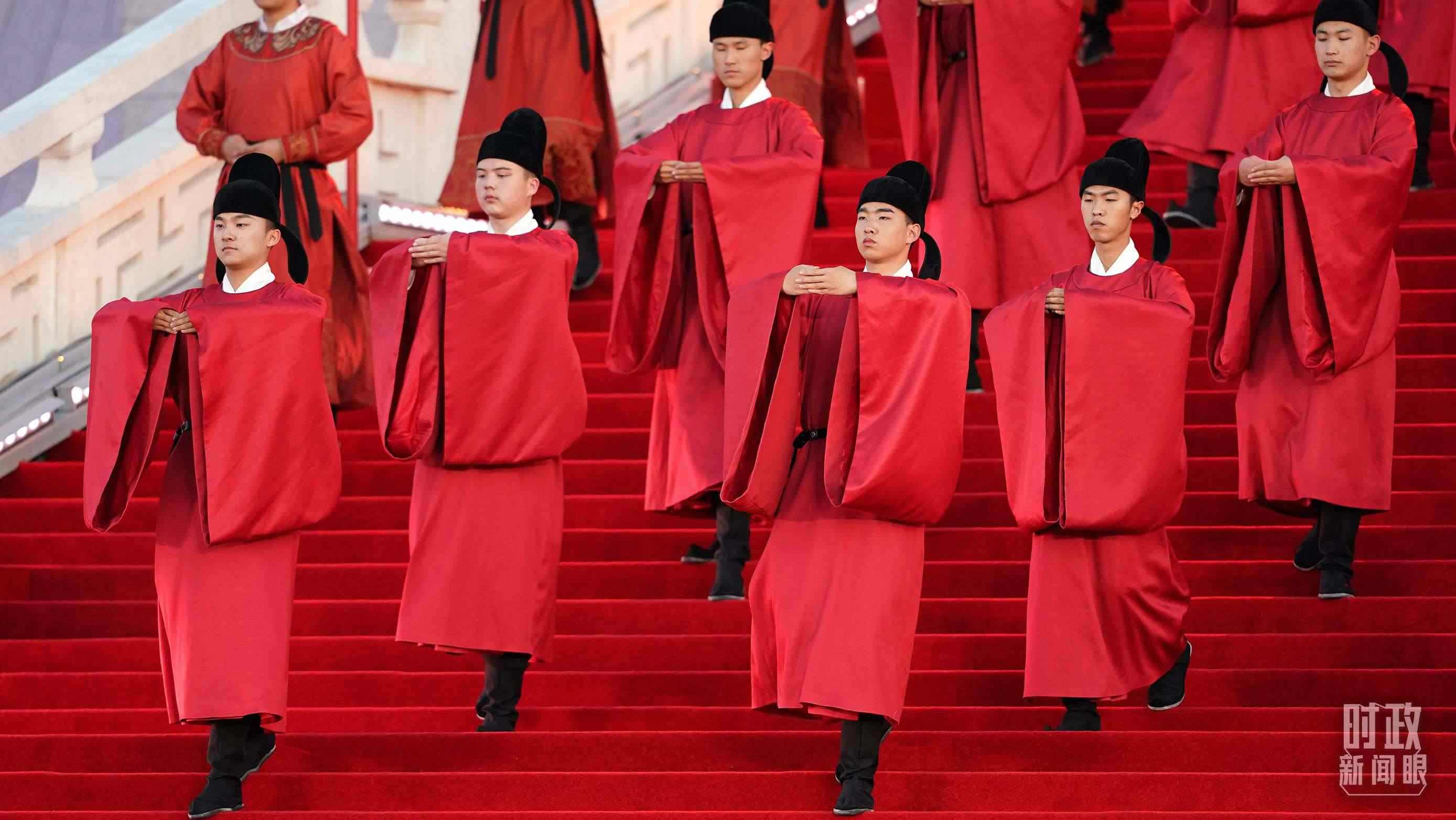 比如,迎賓表演中身著唐代紅色官服的男子,雙手平伸,指尖交錯,左手在外,掌心向內,舉手至額,欠身行禮,以中國傳統的“天揖禮”表達對賓客的敬意。