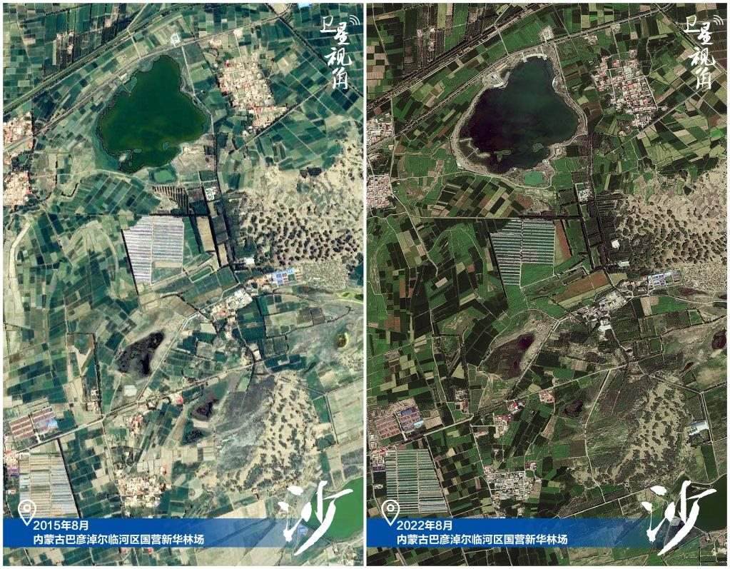 ↑2022年跟2015年相比,從衛(wèi)星圖上下部分看青海湖水體面積擴(kuò)大。