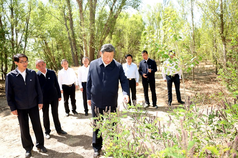 2023年6月5日至6日,中共中央總書(shū)記、國(guó)家主席、中央軍委主席習(xí)近平在內(nèi)蒙古巴彥淖爾考察,并主持召開(kāi)加強(qiáng)荒漠化綜合防治和推進(jìn)“三北”等重點(diǎn)生態(tài)工程建設(shè)座談會(huì)。這是5日下午,習(xí)近平在烏梁素??疾臁P氯A社記者