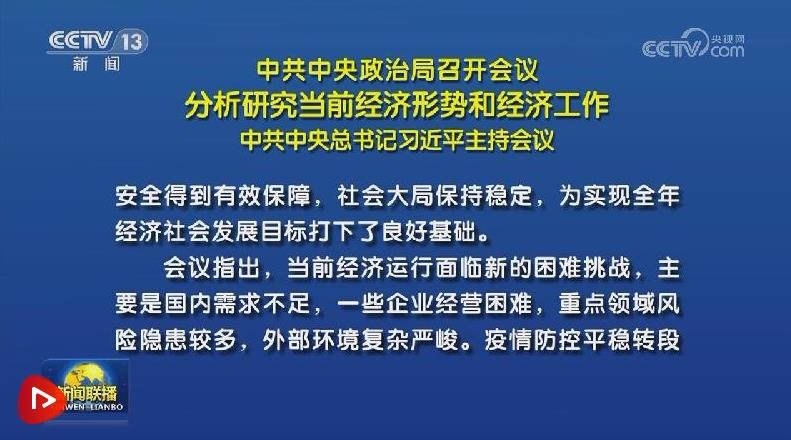 7月24日,中共中央政治局召開會議,分析研究當(dāng)前經(jīng)濟(jì)形勢,部署下半年經(jīng)濟(jì)工作。習(xí)近平總書記主持會議。