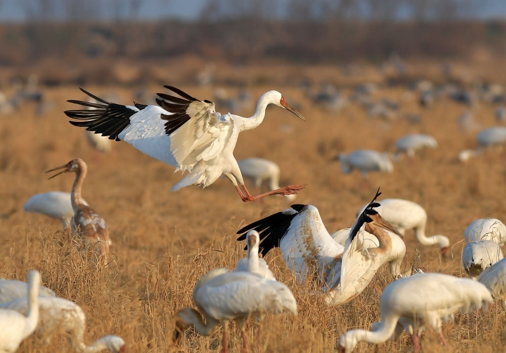 這是2021年1月15日在鄱陽湖畔的江西余干縣康山墾殖場插旗洲拍攝的白鶴。隨著長江重點水域生態(tài)修復措施的落實,鄱陽湖環(huán)境正發(fā)生嬗變。江西鄱陽湖國家級自然保護區(qū)管理局2022年新年伊始發(fā)布的鄱陽湖區(qū)最新鳥情數據顯示,工作人員在野外監(jiān)測統計到水鳥76.6萬余只,創(chuàng)有監(jiān)測記錄以來新高。