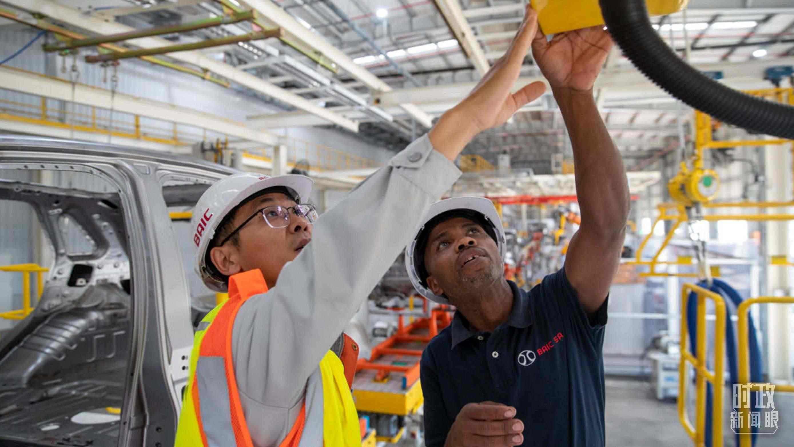 △在南非東開(kāi)普省北汽南非工廠,當(dāng)?shù)貑T工與中國(guó)同事在焊裝車(chē)間內(nèi)工作。(資料圖)