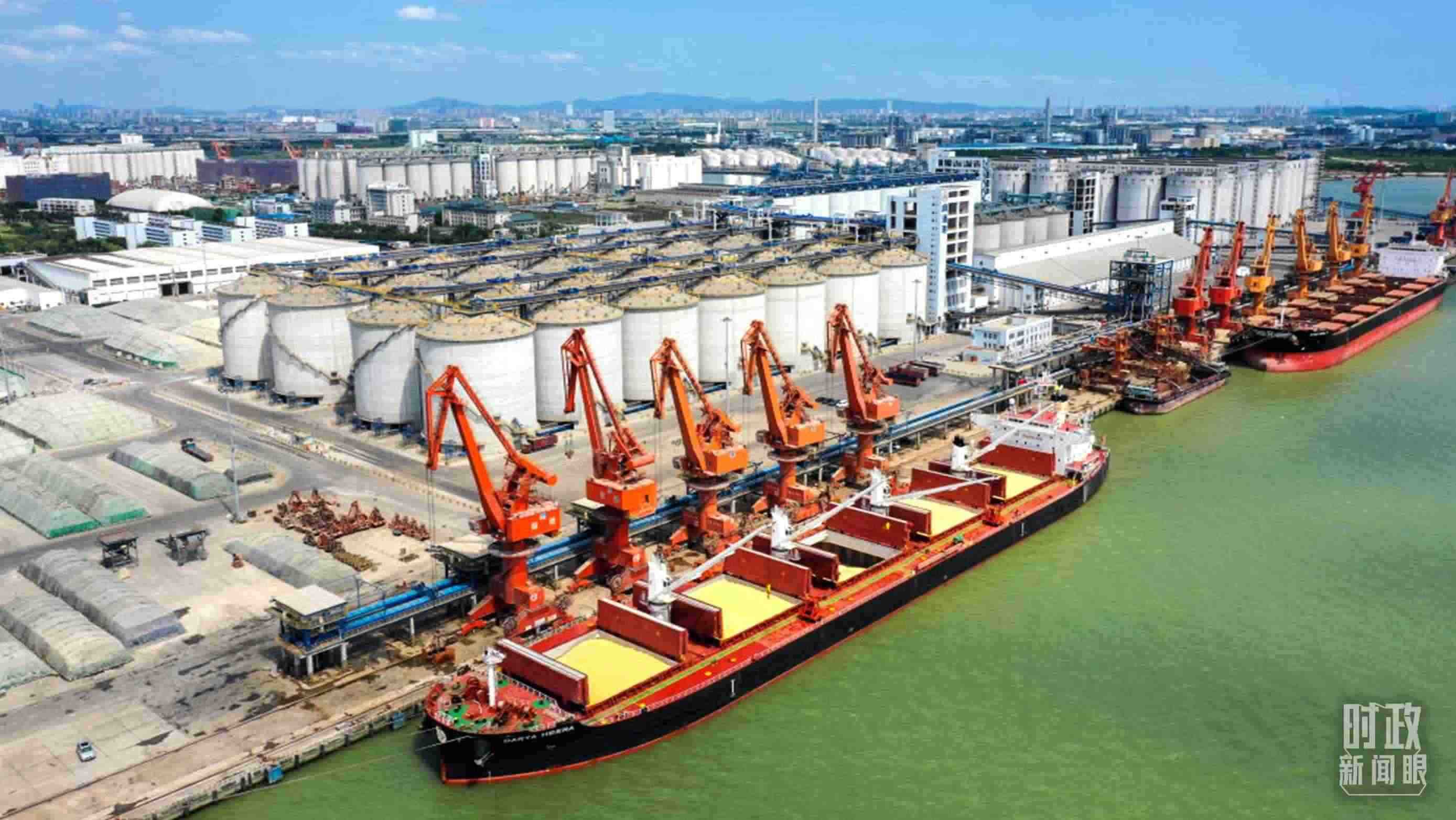 △從南非進(jìn)口的首船飼料玉米靠泊中國(guó)廣東麻涌港。(資料圖)