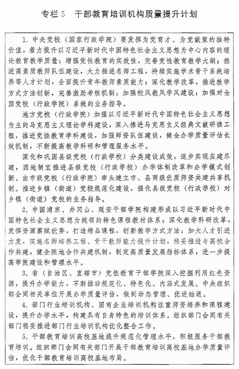 (二)拓寬培訓渠道。根據(jù)黨政領導干部、國有企事業(yè)單位領導人員和機關公務員、年輕干部、基層干部、專業(yè)技術人員等不同對象特點,整合優(yōu)質資源,多渠道多方面開展履職能力培訓。發(fā)揮各級黨校(行政學院)、干部學院主體作用,圍繞黨中央重大決策部署和國家重大戰(zhàn)略需求、地方黨委和政府中心工作開展專題培訓;發(fā)揮部門行業(yè)培訓機構特色優(yōu)勢,開展專門政策解讀、重點任務落實等專題培訓;發(fā)揮國有企業(yè)培訓機構作用,開展國有企業(yè)領導人員治企興企、提高企業(yè)核心競爭力、強化企業(yè)科技創(chuàng)新主體地位等專題培訓;發(fā)揮干部教育培訓高校基地學科專業(yè)優(yōu)勢,開展新知識新技能等培訓;發(fā)揮基層干部教育培訓機構特色優(yōu)勢,開展基層干部實務培訓;發(fā)揮專業(yè)技術人員繼續(xù)教育基地資源優(yōu)勢,開展專業(yè)技術能力提升培訓;發(fā)揮職業(yè)學校(含技工院校)培養(yǎng)高技能人才的基礎性作用,開展技術技能培訓;發(fā)揮中國干部網(wǎng)絡學院等網(wǎng)絡學習平臺廣覆蓋、便捷化的優(yōu)勢,抓好履職通識培訓;發(fā)揮派出單位和接收單位協(xié)作優(yōu)勢,抓好援派幫扶干部人才、掛職干部等教育培訓。積極創(chuàng)造條件,支持干部在職自學。實施干部履職能力提升計劃(專欄4)。