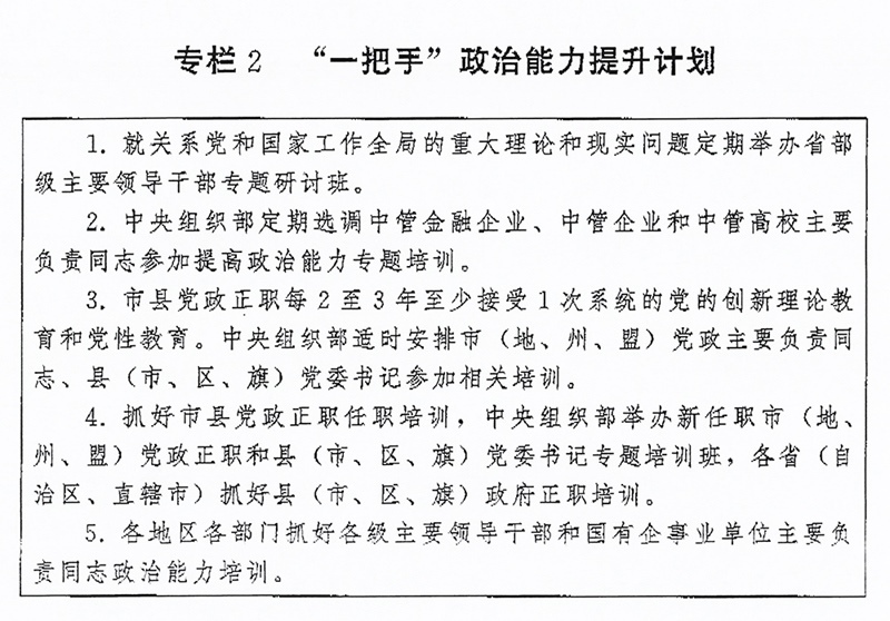 (二)突出“關鍵少數(shù)”政治訓練。堅持把政治訓練貫穿干部成長全周期,使干部的政治素養(yǎng)、政治能力與擔負的領導職責相匹配。強化“一把手”政治培訓,有計劃地選調(diào)地方、部門、國有企事業(yè)單位主要負責同志到黨校(行政學院)、干部學院參加專題培訓。實施“一把手”政治能力提升計劃(專欄2)。?。ㄗ灾螀^(qū)、直轄市)、市(地、州、盟)、縣(市、區(qū)、旗)黨政領導班子成員每2至3年到黨校(行政學院)、干部學院至少接受1次系統(tǒng)的黨的創(chuàng)新理論教育和黨性教育,5年內(nèi)累計不少于2個月。圍繞提高政治能力和領導能力,加強機關司局長、處長任職培訓。重視對女干部、少數(shù)民族干部、黨外干部等的政治培訓。加強對高層次人才的政治引領,中央組織部會同有關單位每年組織一定數(shù)量人才開展國情研修。