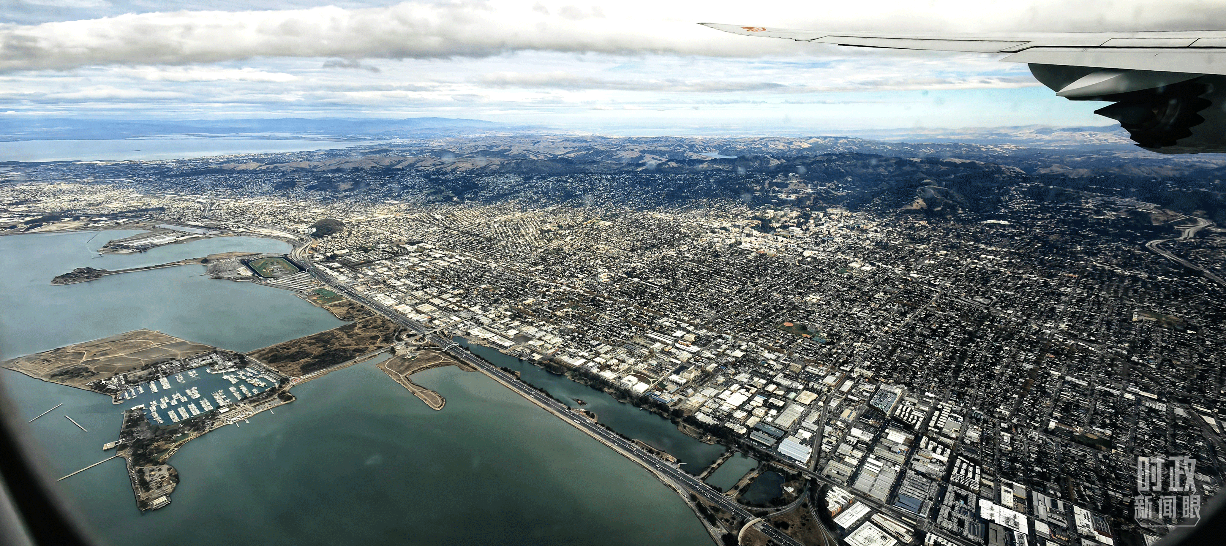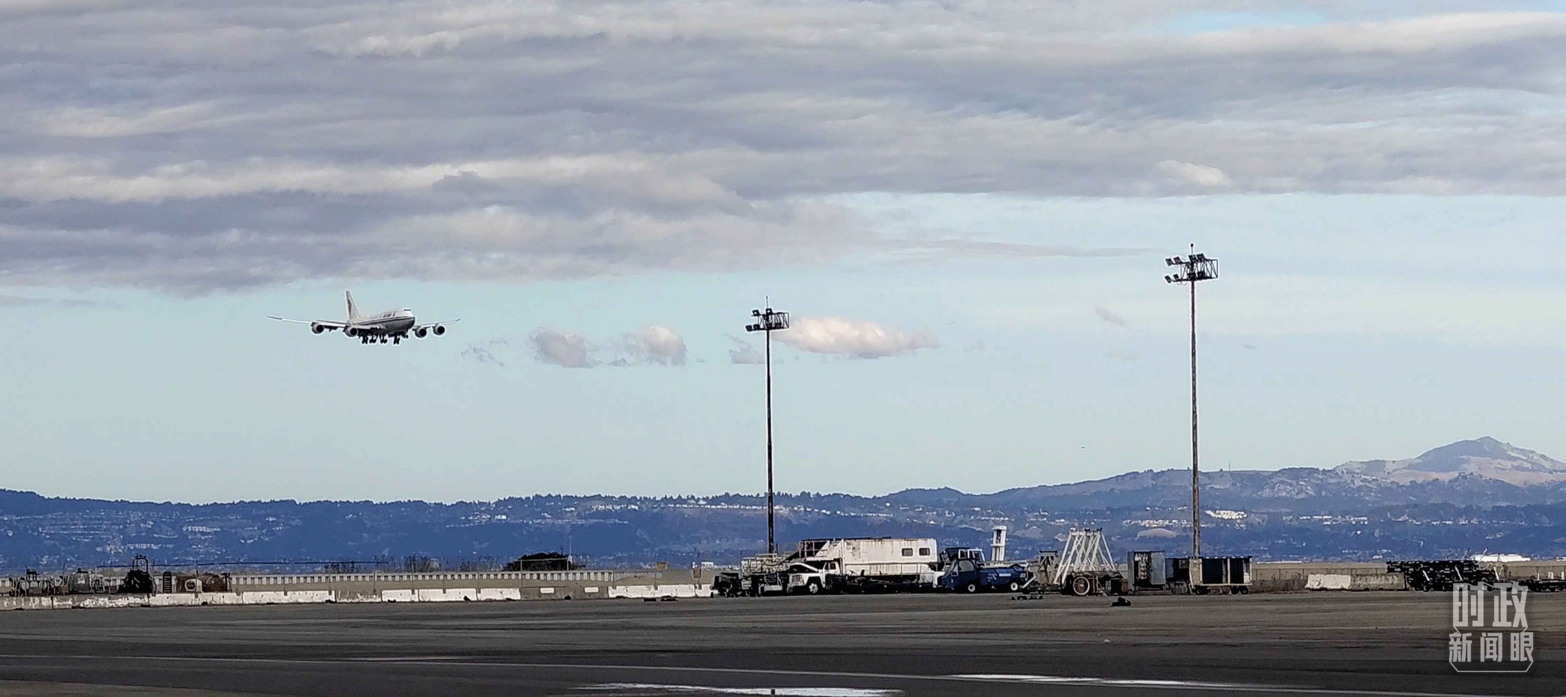 △習(xí)近平乘坐的專機(jī)即將降落舊金山國際機(jī)場。(總臺央視記者張曉鵬拍攝)
