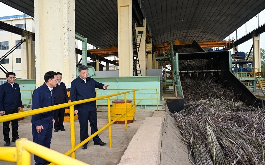 14日下午,習近平總書記在廣西來賓市考察調(diào)研。他先后來到來賓市國家現(xiàn)代農(nóng)業(yè)產(chǎn)業(yè)園黃安優(yōu)質(zhì)“雙高”糖料蔗基地和東糖鳳凰有限公司,了解甘蔗良種繁育、種植收成、糖產(chǎn)業(yè)發(fā)展等情況。(人民日報記者 徐雋)