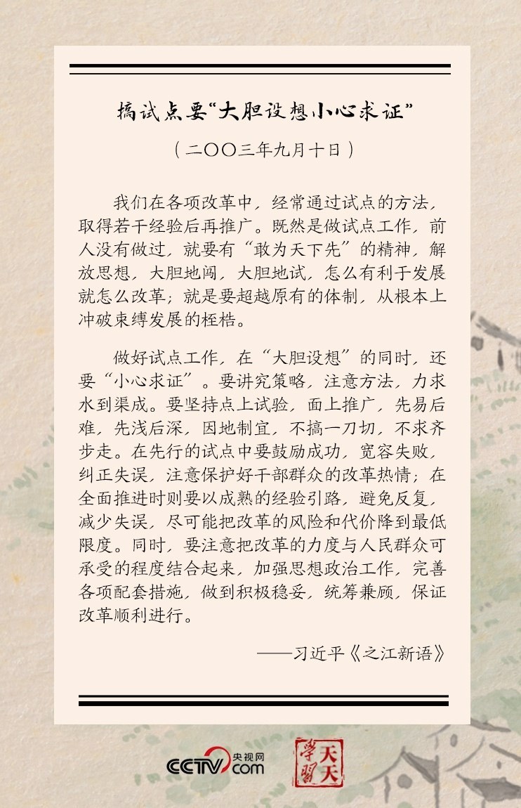 習(xí)近平還進(jìn)一步分析,做好試點(diǎn)工作,在“大膽設(shè)想”的同時,還要“小心求證”……要堅(jiān)持點(diǎn)上試驗(yàn),面上推廣,先易后難,先淺后深,因地制宜,不搞一刀切,不求齊步走……