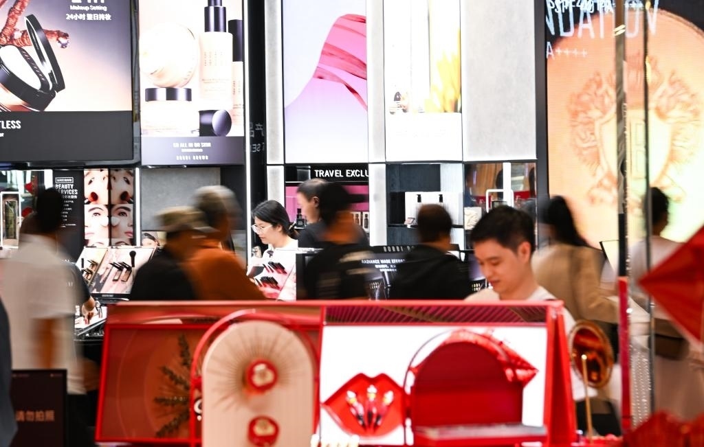 2023年10月28日,消費(fèi)者在位于海南省??谑械暮?趪?guó)際免稅城內(nèi)購(gòu)物。新華社記者楊冠宇 攝
