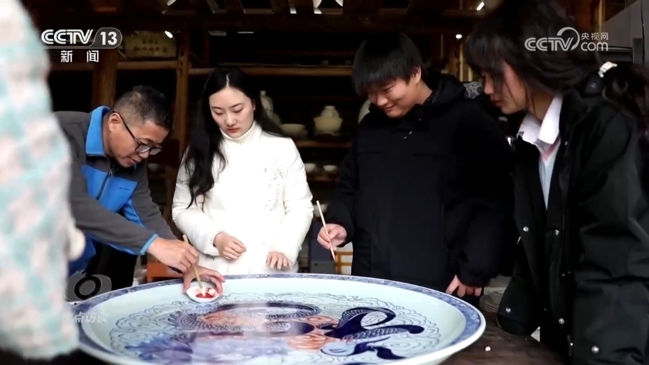 春節(jié)將近,景德鎮(zhèn)青花瓷畫坯技藝非遺傳承人孫立新和徒弟們正在制作迎接新年的龍盤,要在這個(gè)直徑1米的瓷盤上用龍的造型呈現(xiàn)出福字。