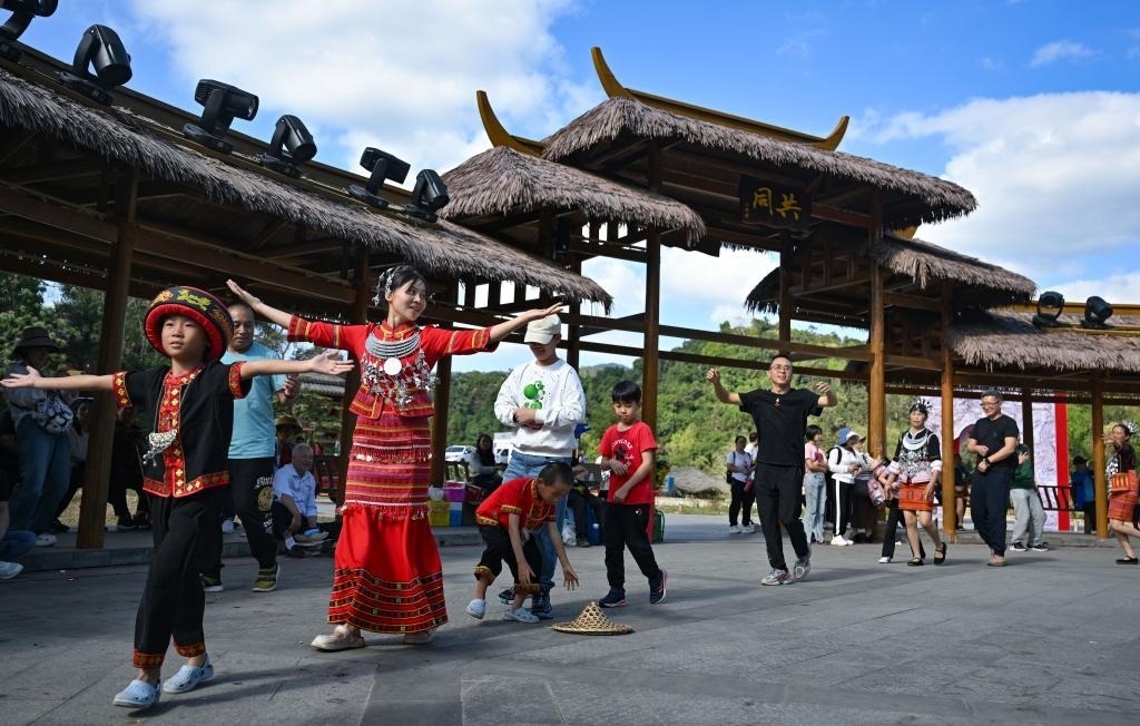 2月14日,游客與毛納村的歌舞隊員一起跳黎族共同舞。新華社記者郭程 攝
