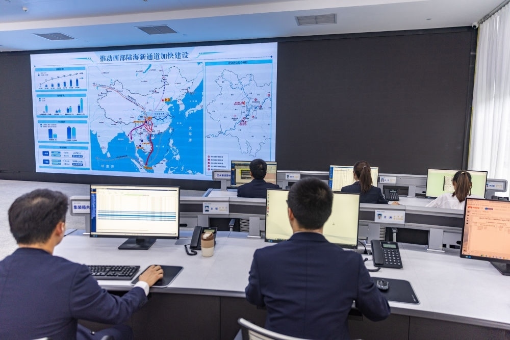2024年4月22日,工作人員在西部陸海新通道運(yùn)營(yíng)調(diào)度中心工作。工作人員可以在大屏上實(shí)時(shí)了解班列在邊境口岸的出入境信息。