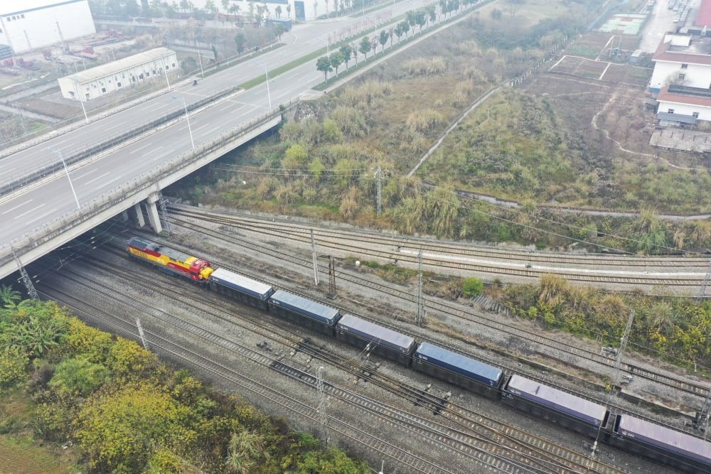 2023年1月22日,一趟西部陸海新通道鐵海聯(lián)運(yùn)班列從重慶團(tuán)結(jié)村中心站發(fā)車(無人機(jī)照片)。班列滿載著汽車、摩托車、發(fā)動(dòng)機(jī)和純堿等共計(jì)100個(gè)集裝箱的貨物,將經(jīng)廣西欽州港換乘海船去往印度尼西亞、菲律賓、喀麥隆、澳大利亞等國(guó)家和地區(qū)。
