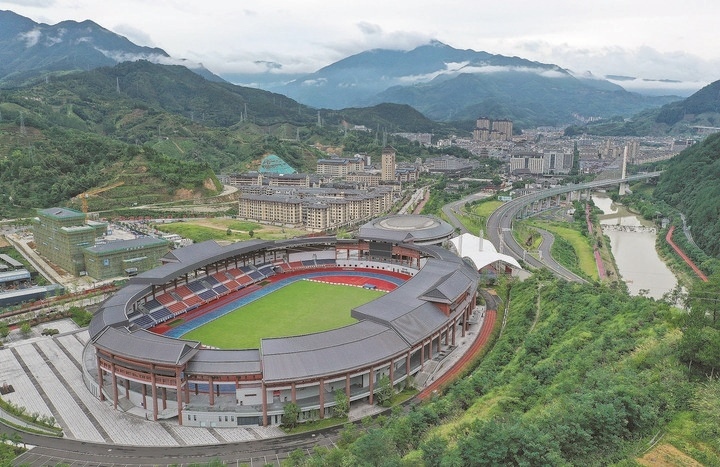 集籃球館、足球場、氣排球場、網(wǎng)球場等設施于一體的景寧體育公園。記者 林云龍 徐彥 葉錦霞 攝