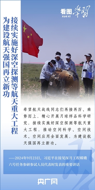 中國(guó)探月工程成果凝結(jié)著我國(guó)幾代航天人的智慧和心血。9月23日,習(xí)近平總書記接見探月工程嫦娥六號(hào)任務(wù)參研參試人員代表并發(fā)表重要講話??倳浉叨瓤隙ㄦ隙鹆?hào)任務(wù)成功的重要意義,以及探月工程為我國(guó)航天事業(yè)發(fā)展、為人類探索宇宙空間作出的重大貢獻(xiàn),勉勵(lì)航天戰(zhàn)線工作者再接再厲、乘勢(shì)而上,為建設(shè)航天強(qiáng)國(guó)再立新功。一起來學(xué)習(xí)!