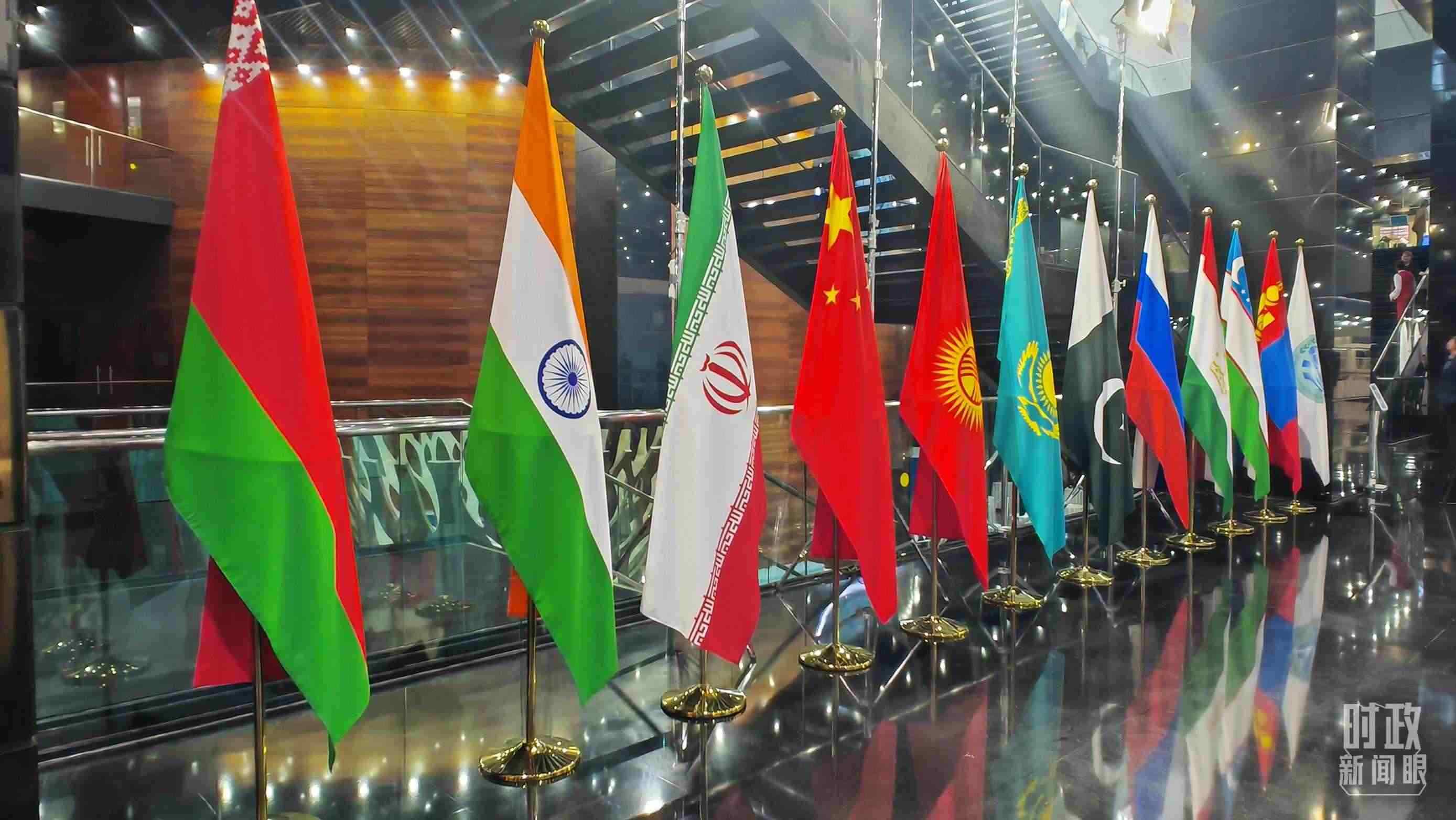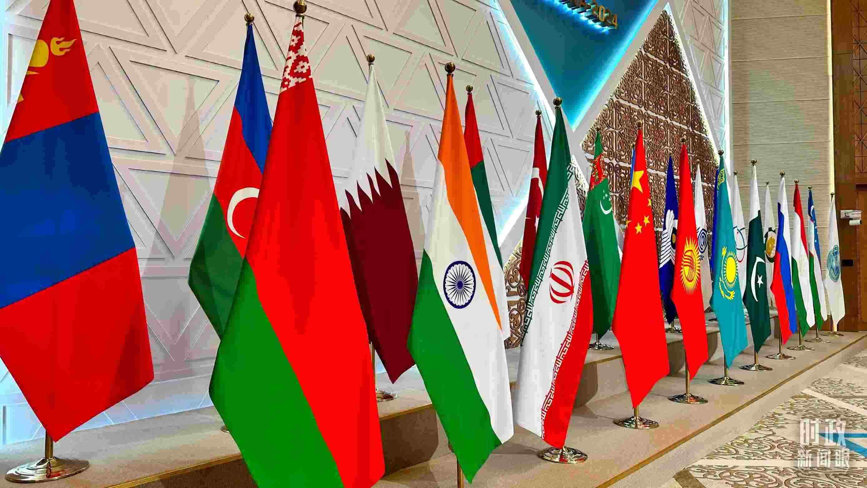 △阿斯塔納峰會(huì)現(xiàn)場(chǎng)擺放的旗幟。(總臺(tái)央視記者關(guān)舟拍攝)