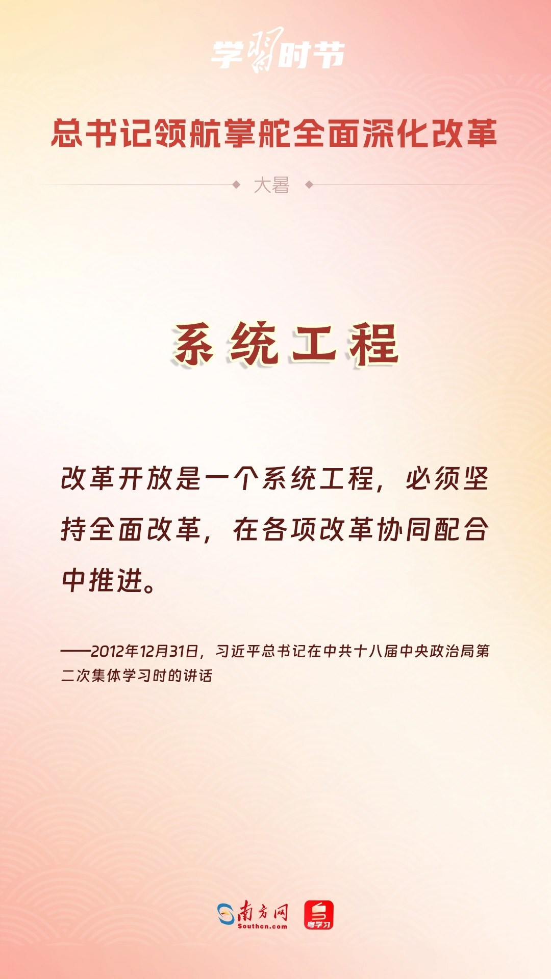 黨的十八大以來(lái),習(xí)近平總書(shū)記親自領(lǐng)導(dǎo)、親自部署、親自推動(dòng)全面深化改革工作,推動(dòng)全面深化改革事業(yè)在攻堅(jiān)克難中不斷邁上新臺(tái)階、取得新勝利。在驕陽(yáng)似火的大暑時(shí)節(jié),通過(guò)一組海報(bào),讓我們共同學(xué)習(xí)習(xí)近平總書(shū)記關(guān)于“全面深化改革”的重要論述。