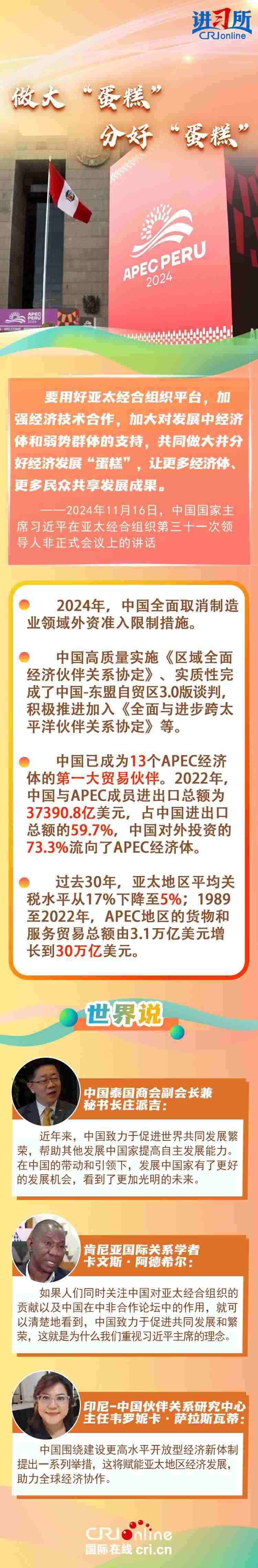 自1991年加入APEC以來(lái),中國(guó)作為關(guān)鍵一員,持續(xù)為亞太地區(qū)成為世界經(jīng)濟(jì)的“火車(chē)頭”輸出關(guān)鍵穩(wěn)定力量,習(xí)近平主席表示,“落其實(shí)者思其樹(shù),飲其流者懷其源”。中國(guó)的發(fā)展離不開(kāi)亞太,也將進(jìn)一步造福亞太。多國(guó)人士表示,在中國(guó)的帶動(dòng)和引領(lǐng)下,發(fā)展中國(guó)家有了更好的發(fā)展機(jī)會(huì),看到了更加光明的未來(lái)。