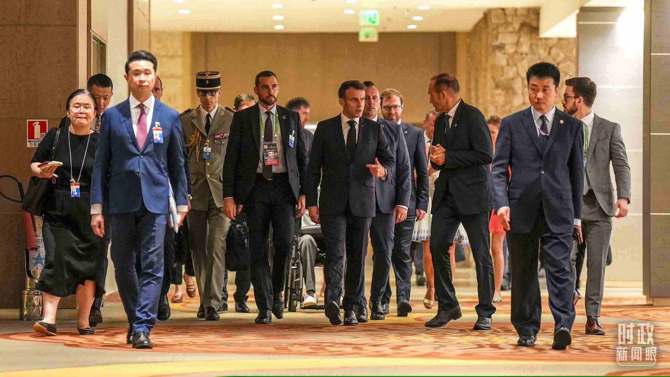 △法國(guó)總統(tǒng)馬克龍前往會(huì)場(chǎng)。(總臺(tái)記者李晉拍攝)