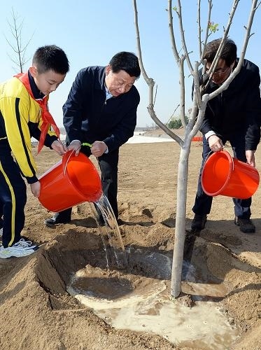 (2014年4月,習(xí)近平總書記在團(tuán)城湖調(diào)節(jié)池參加義務(wù)植樹活動(dòng))