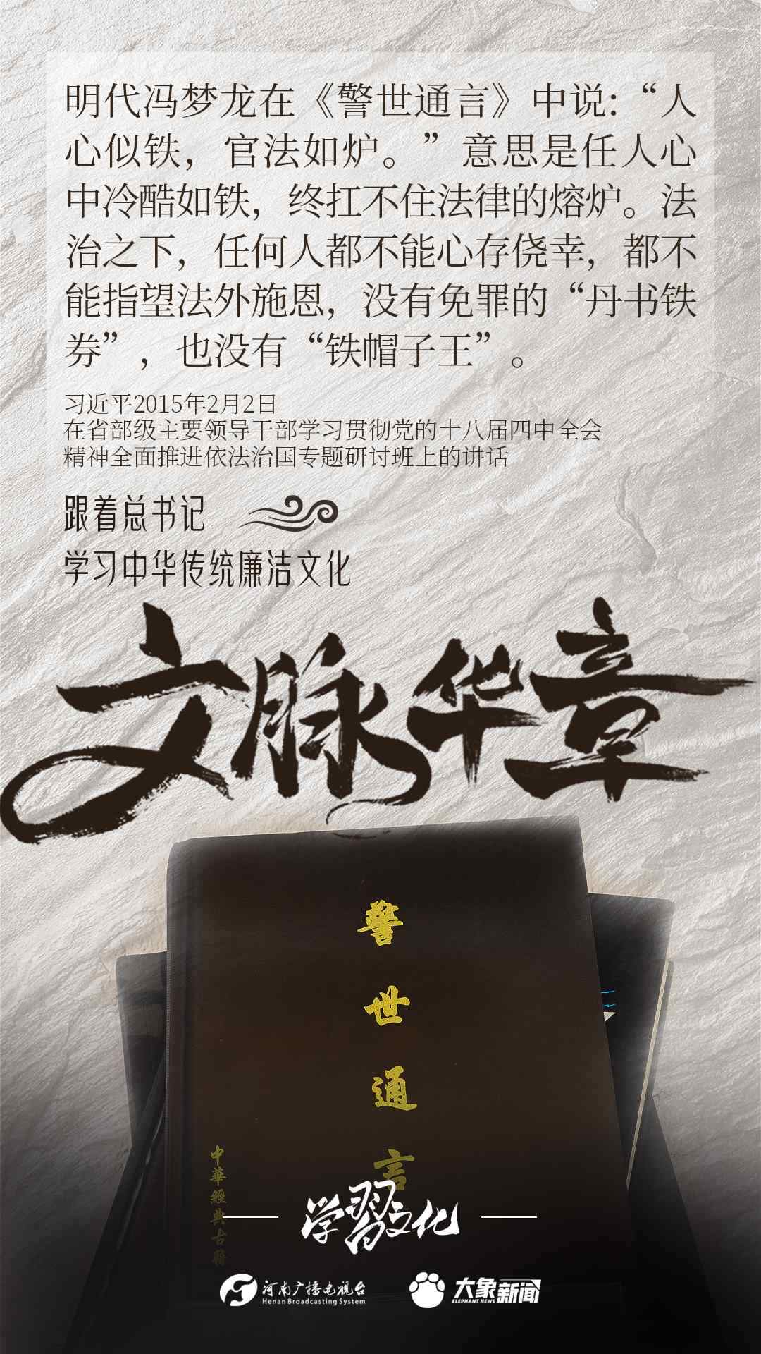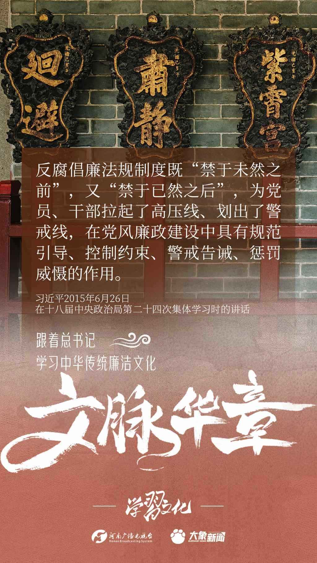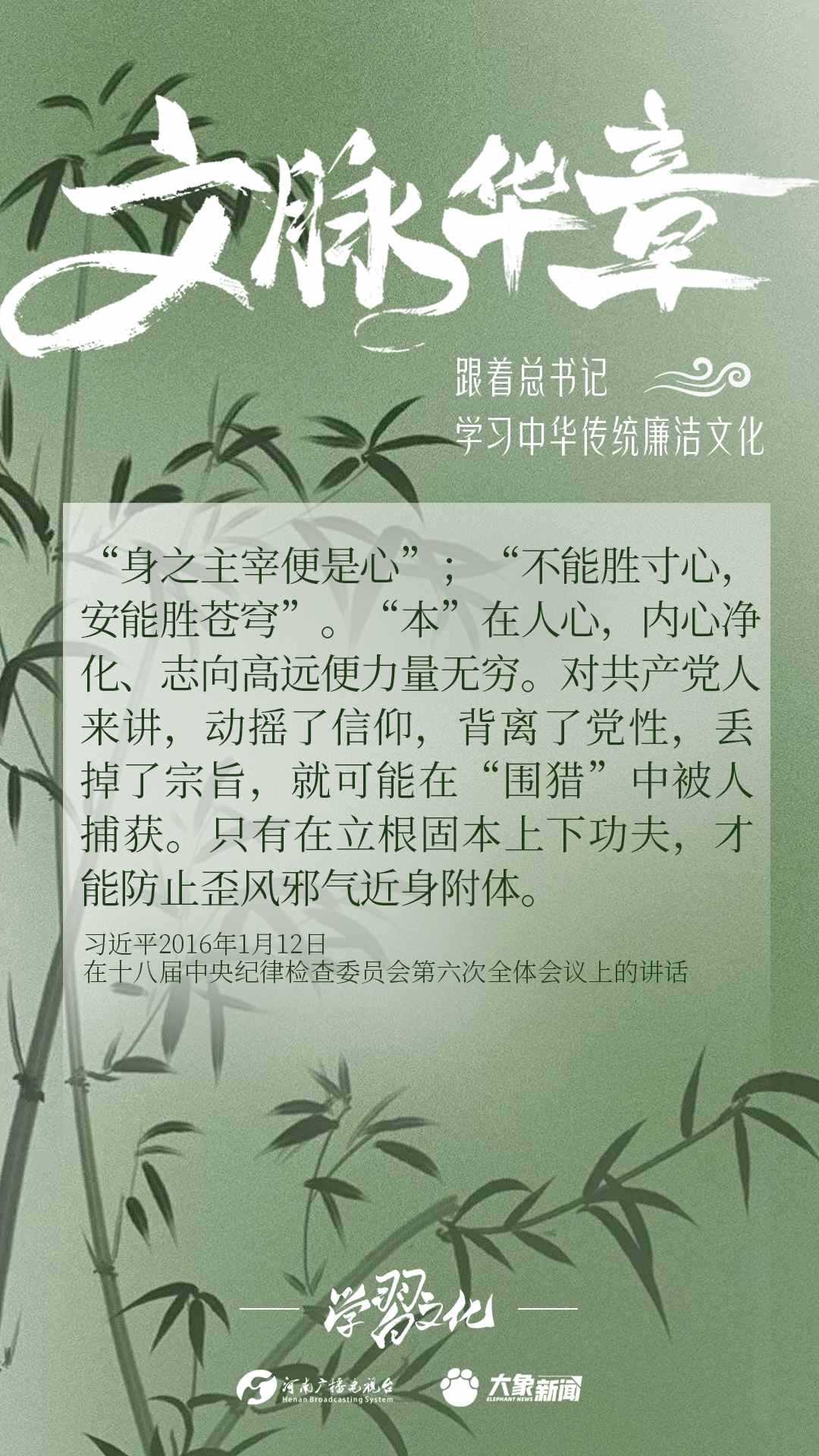 中華優(yōu)秀傳統(tǒng)文化蘊(yùn)含著豐富的廉潔文化,習(xí)近平總書記曾指出:沒(méi)有中華優(yōu)秀傳統(tǒng)文化、革命文化、社會(huì)主義先進(jìn)文化的底蘊(yùn)和滋養(yǎng),信仰信念就難以深沉而執(zhí)著。總書記常常引經(jīng)據(jù)典,教育引導(dǎo)廣大黨員干部正心修身,涵養(yǎng)文化,守住為政之本。大象新聞分五期為您梳理,我們一起跟著總書記學(xué)習(xí)中華傳統(tǒng)廉潔文化。今天推出第四期。