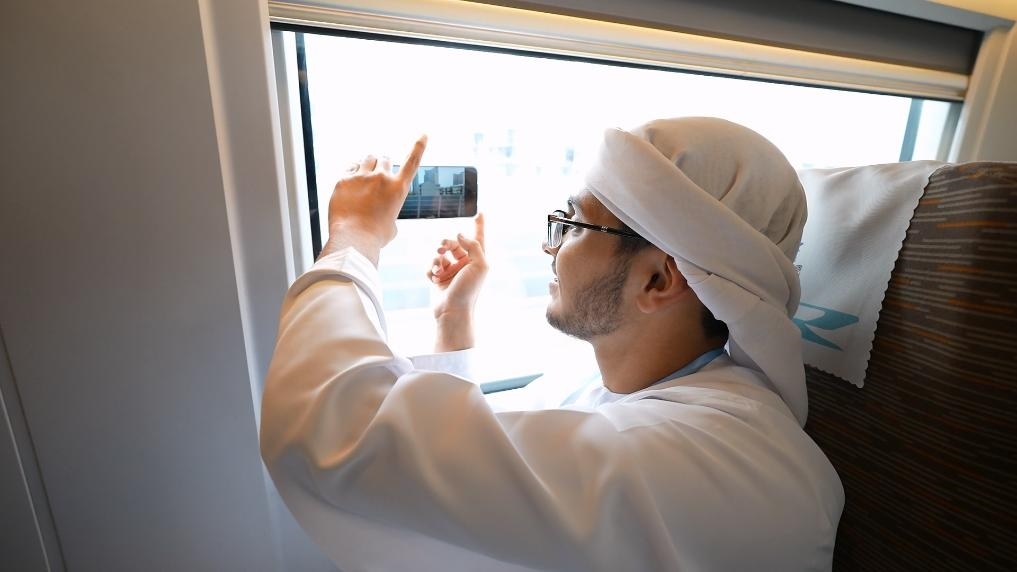 4月7日,從北京開往天津站的高鐵上,一名阿聯(lián)酋學生用手機拍攝窗外風景。新華社記者 胡震澤 攝