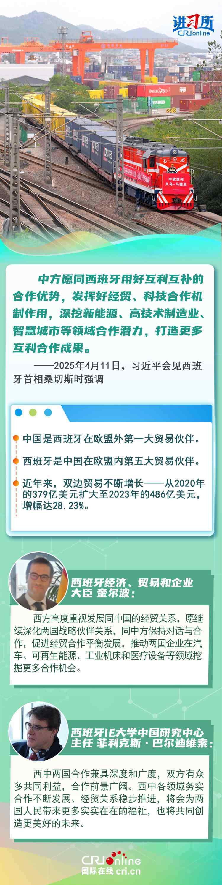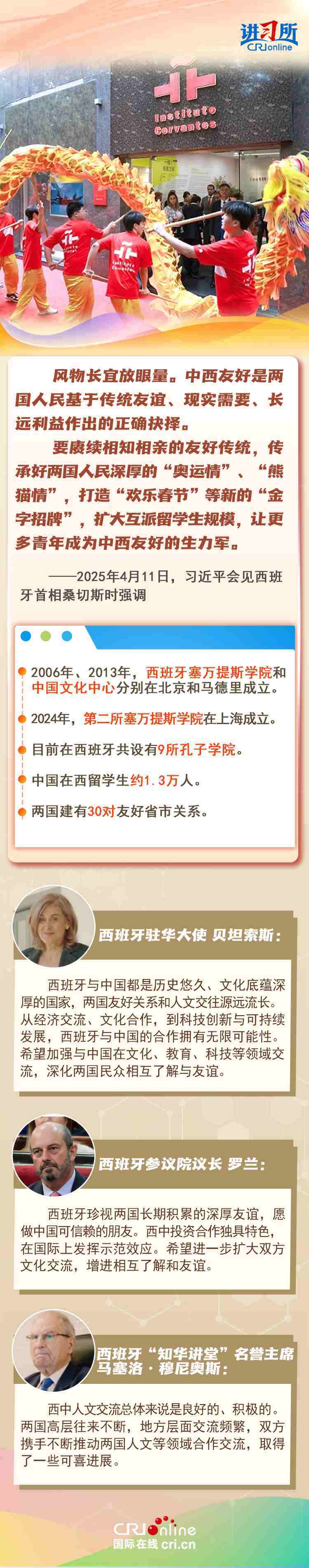 今年是中西全面戰(zhàn)略伙伴關(guān)系建立20周年,也是中歐建交50周年。多年來,中西兩國領(lǐng)導(dǎo)人保持密切互動(dòng),秉持互尊互信、互利共贏精神,兩國在深化貿(mào)易、投資、科技創(chuàng)新、綠色能源等領(lǐng)域取得豐富合作成果,雙邊關(guān)系走在中國同歐洲國家關(guān)系前列。在西班牙人士眼中,良好的對華關(guān)系對西班牙、歐洲和世界具有重要意義,將會(huì)為兩國人民帶來更多實(shí)實(shí)在在的福祉,也將共同創(chuàng)造更美好的未來。