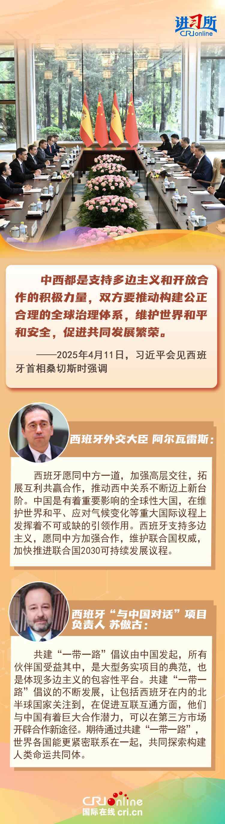 4月11日,中國國家主席習(xí)近平在北京會(huì)見來華訪問的西班牙首相桑切斯時(shí)表示,中西友好是兩國人民基于傳統(tǒng)友誼、現(xiàn)實(shí)需要、長遠(yuǎn)利益作出的正確抉擇,中西都是支持多邊主義和開放合作的積極力量,雙方要推動(dòng)構(gòu)建公正合理的全球治理體系,維護(hù)世界和平和安全,促進(jìn)共同發(fā)展繁榮。