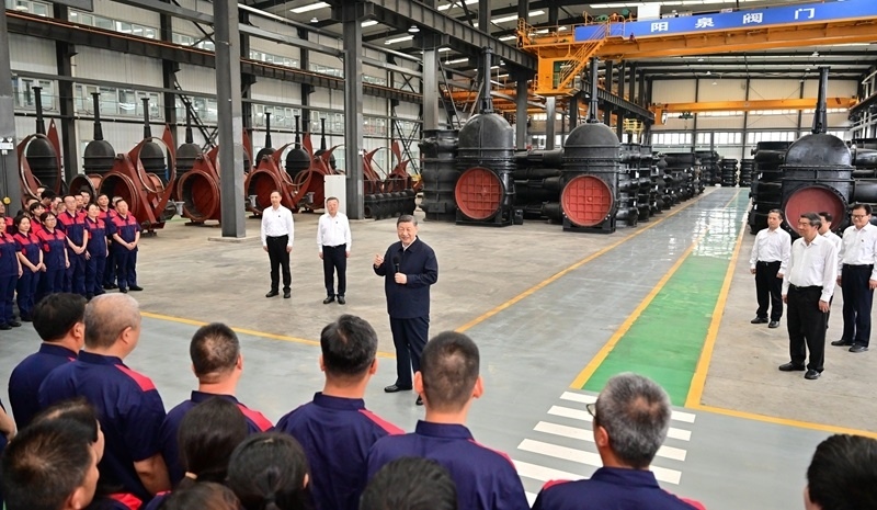 7月7日至8日,中共中央總書記、國家主席、中央軍委主席習(xí)近平在山西考察。這是7日下午,習(xí)近平在陽泉閥門股份有限公司考察時(shí),同企業(yè)員工在一起。新華社記者 燕雁 攝