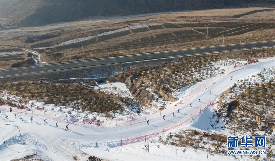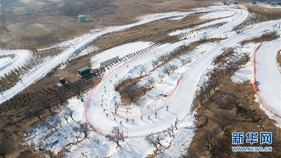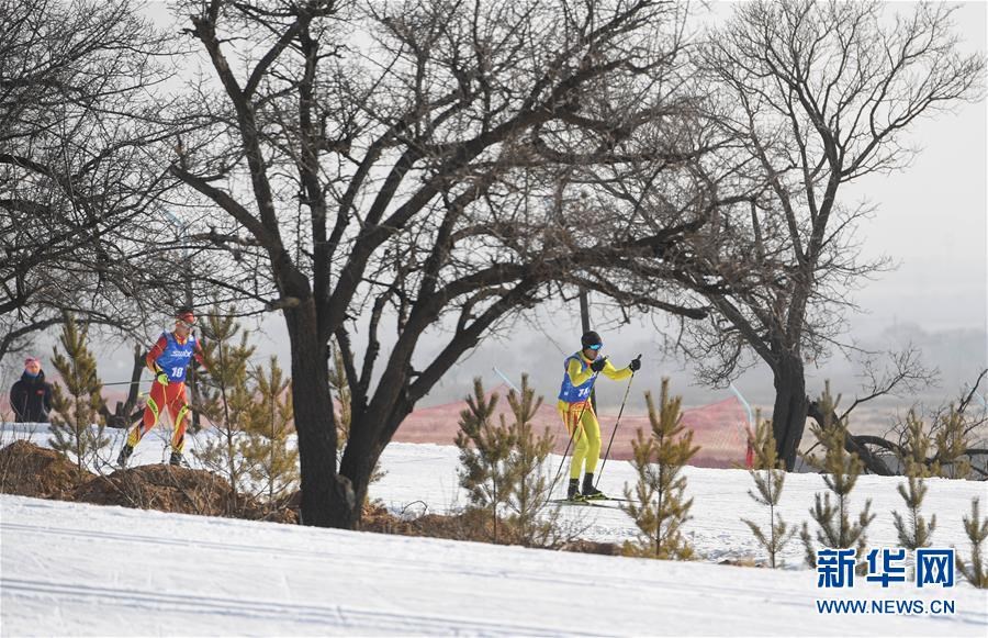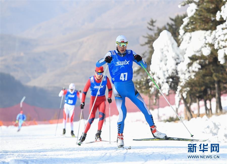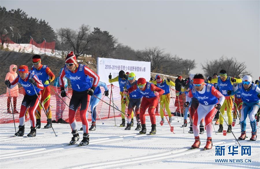 1月11日至1月15日,2018-2019年度全國青少年越野滑雪錦標賽在內蒙古烏蘭察布市涼城縣岱?;﹫雠e行。這是選手在青年組男子30公里集體出發(fā)(自由技術)比賽中(1月12日攝)。新華社記者彭源攝