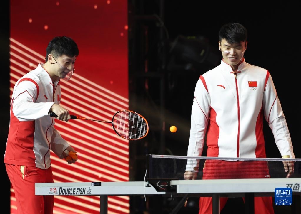 12月20日,內地奧運健兒代表團成員馬龍(左)與王懿律在活動中參與游戲。