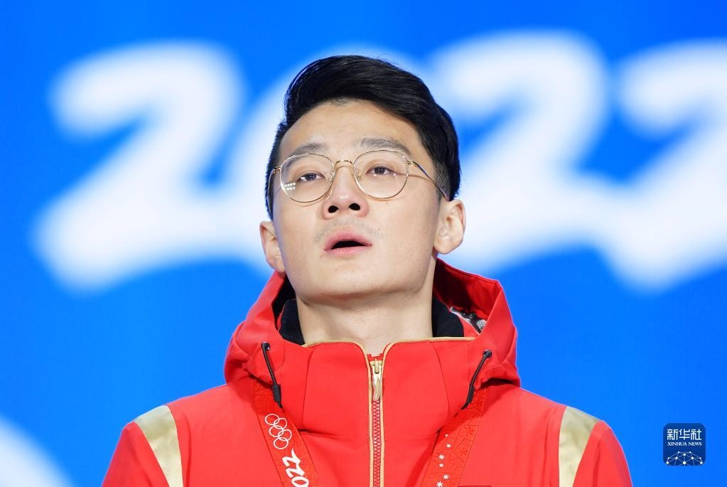 2月8日,冠軍中國隊(duì)選手任子威在獎(jiǎng)牌頒發(fā)儀式上。