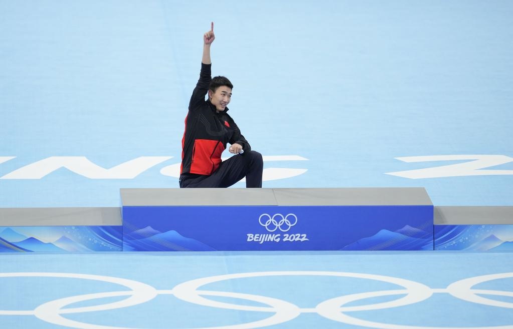 2月12日,冠軍中國選手高亭宇在獎牌頒發(fā)儀式上一躍而上頒獎臺。新華社記者程婷婷攝