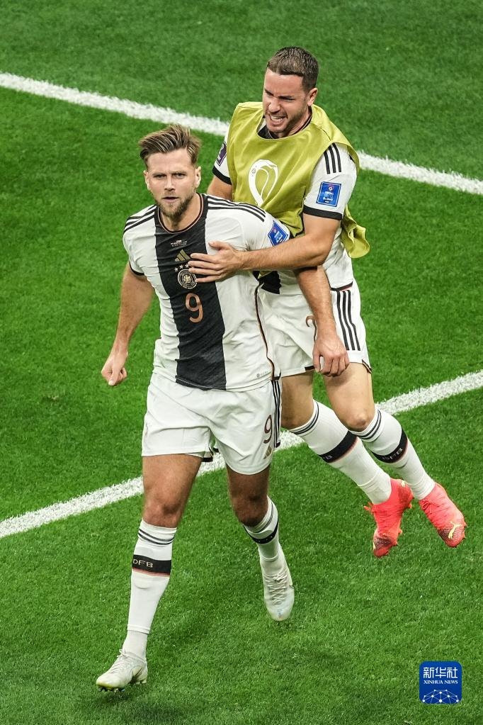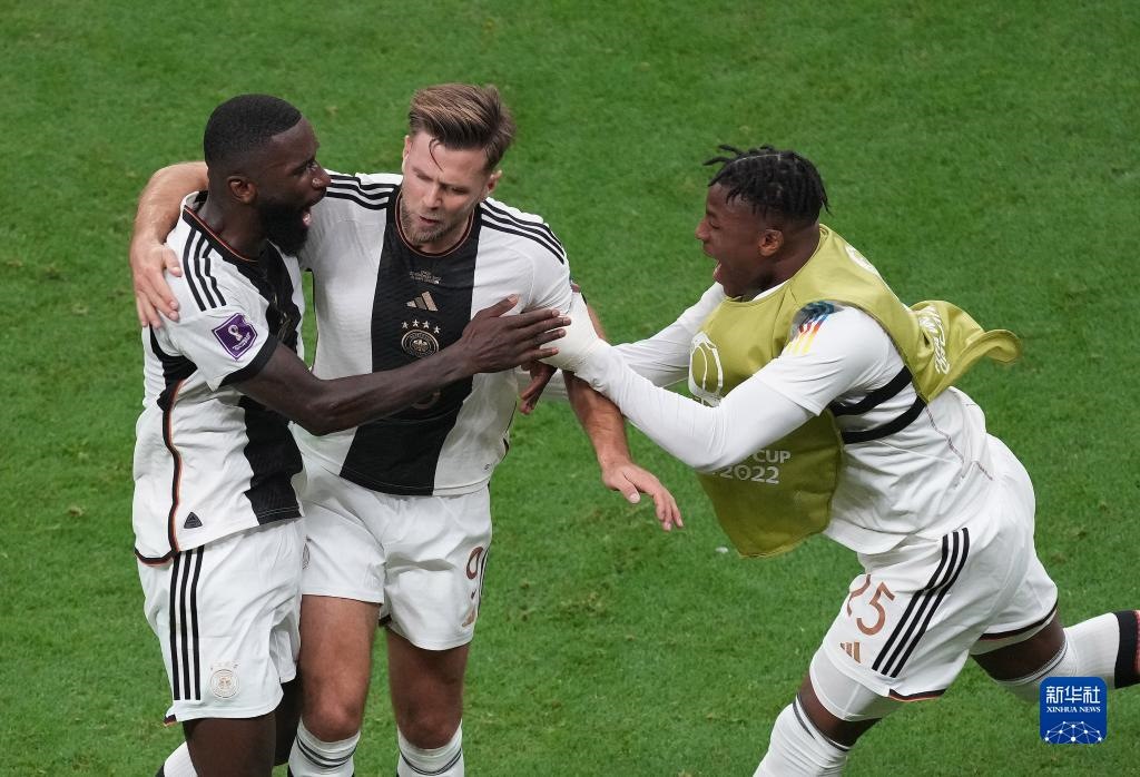 11月27日,德國隊(duì)球員尼克拉斯·菲爾克魯格(左)在比賽中進(jìn)球后與隊(duì)友慶祝。新華社記者 潘昱龍 攝