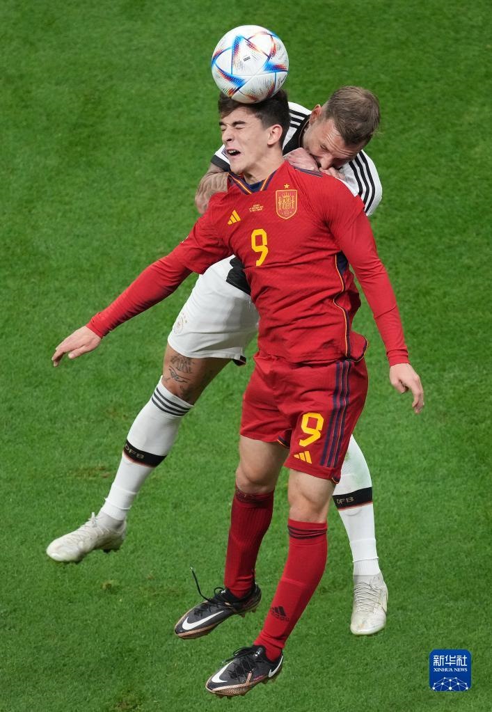 11月27日,西班牙隊(duì)球員加維(前)與德國隊(duì)球員戴維·勞姆在比賽中爭頂。新華社記者 陳誠 攝