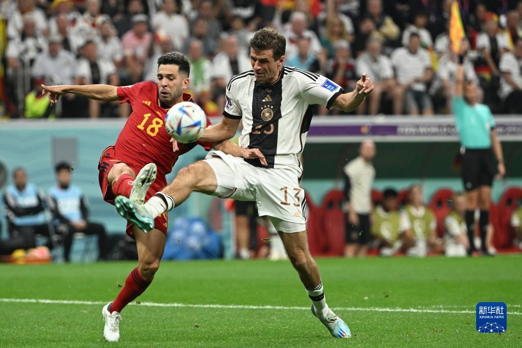 11月27日,西班牙隊(duì)球員阿爾巴(左)與德國隊(duì)球員托馬斯·穆勒在比賽中拼搶。新華社記者 李尕 攝