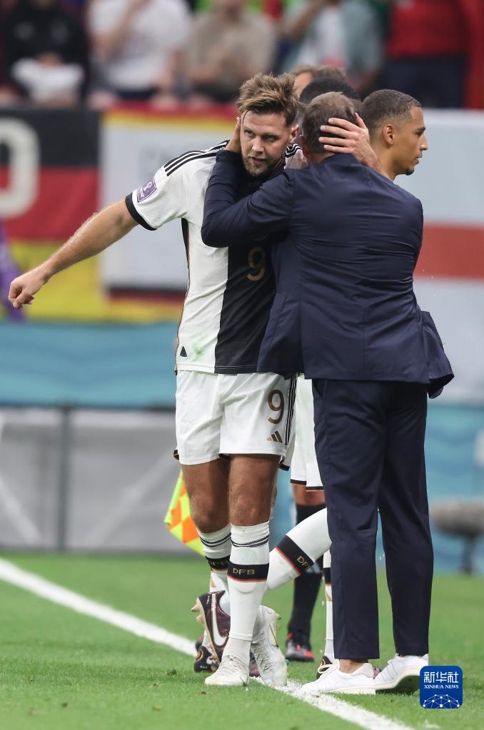 11月27日,德國隊(duì)球員尼克拉斯·菲爾克魯格(左)在比賽中進(jìn)球后與主教練漢斯·弗利克慶祝。新華社記者 曹燦 攝