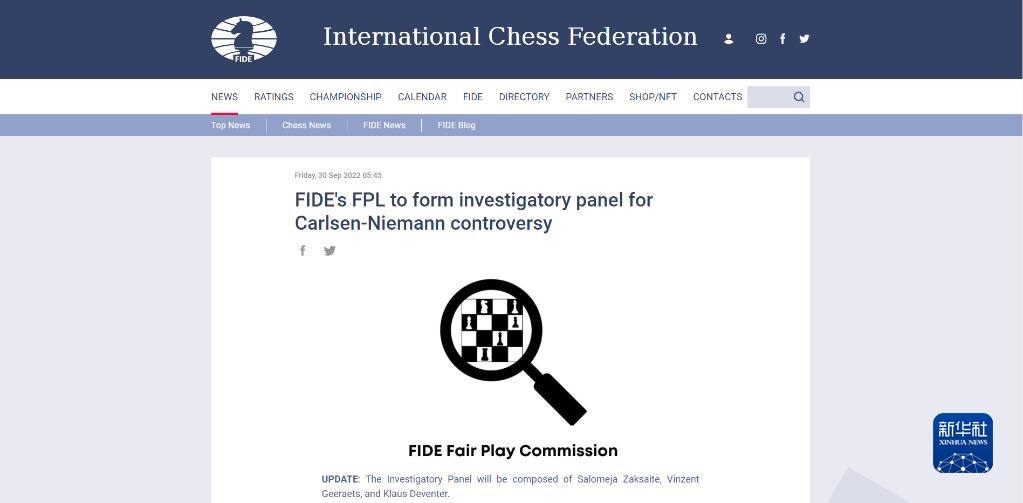 這是國際棋聯(lián)2022年9月30日在官網(wǎng)公布的關(guān)于作弊風(fēng)波,決定成立調(diào)查小組的新聞頁面。新華社發(fā)