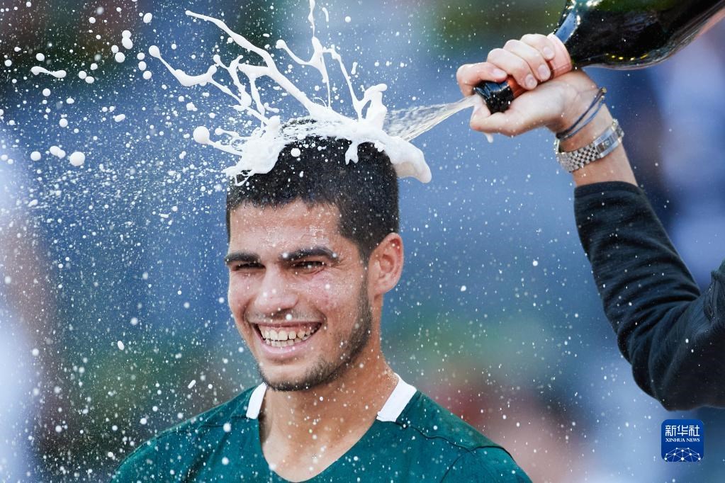 這是2022年5月8日,阿爾卡拉斯在馬德里網(wǎng)球公開賽男子單打頒獎(jiǎng)儀式上慶祝。新華社記者 孟鼎博 攝