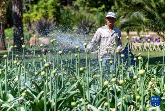 4月3日,一名工作人員在昆明植物園中烏全球蔥園(昆明中心)為蔥屬植物澆水。